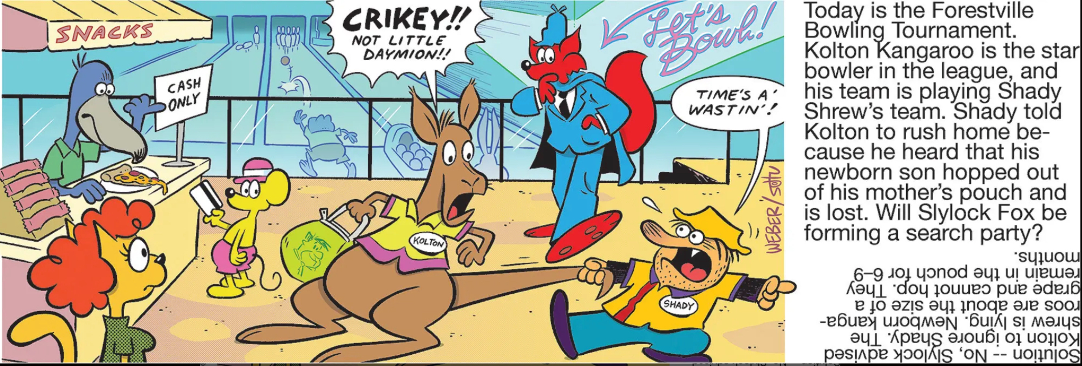 I know that this multispecies society of sapient animals is still finding its footing, and maybe they haven’t gotten their education system really organized yet, but the fact that Kolton Kangaroo is so ignorant of marsupial reproductive biology is frankly embarrassing. Honestly if he doesn’t understand how capable of movement his own child is, he deserves to be a victim of whatever kind of scam Shady is pulling on him here.